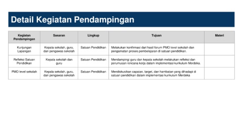 PMO level sekolah Kepala sekolah, guru, Satuan Pendidikan Mendiskusikan capaian, target, dan hambatan yang dihadapi di