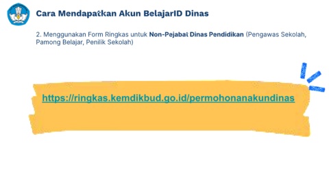 Cara Mendapatkan Akun BelajarID Dinas 2. Menggunakan Form Ringkas untuk Non-Pejabat Dinas Pendidikan (Pengawas Sekolah, Pamong Belajar, Penilik Sekolah) https://ringkas.kemdikbud.go.id/permohonanakundinas