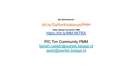 Mari Berkolaborasi! bit.ly/DaftarKolaborasiPMM Daftar Sebagai Kontributor PMM https://bit.ly/MM-MITRA PIC Tim Community PMM faidah.nailatir@wartek.belajar.id qadri@wartek.belajar.id